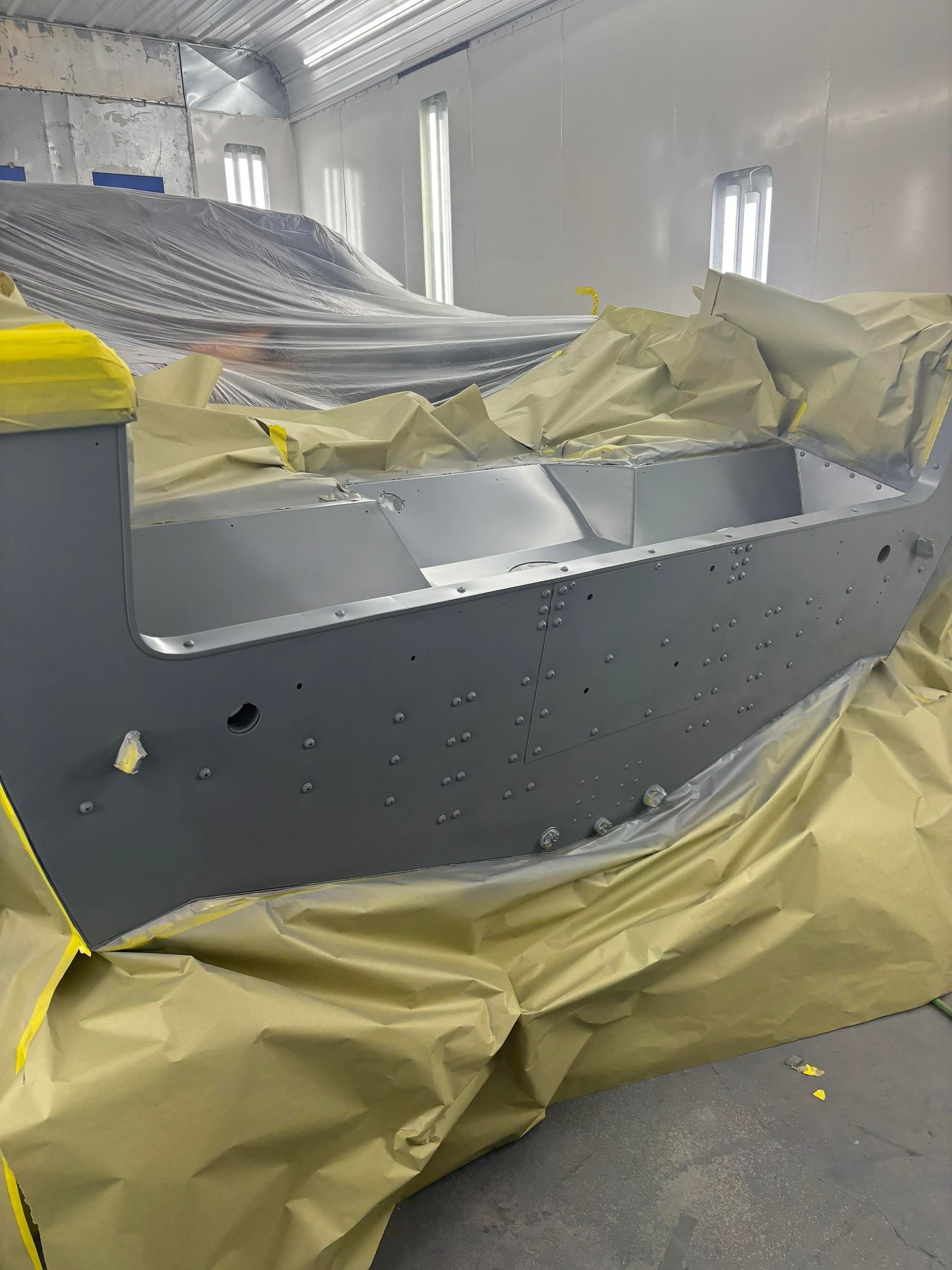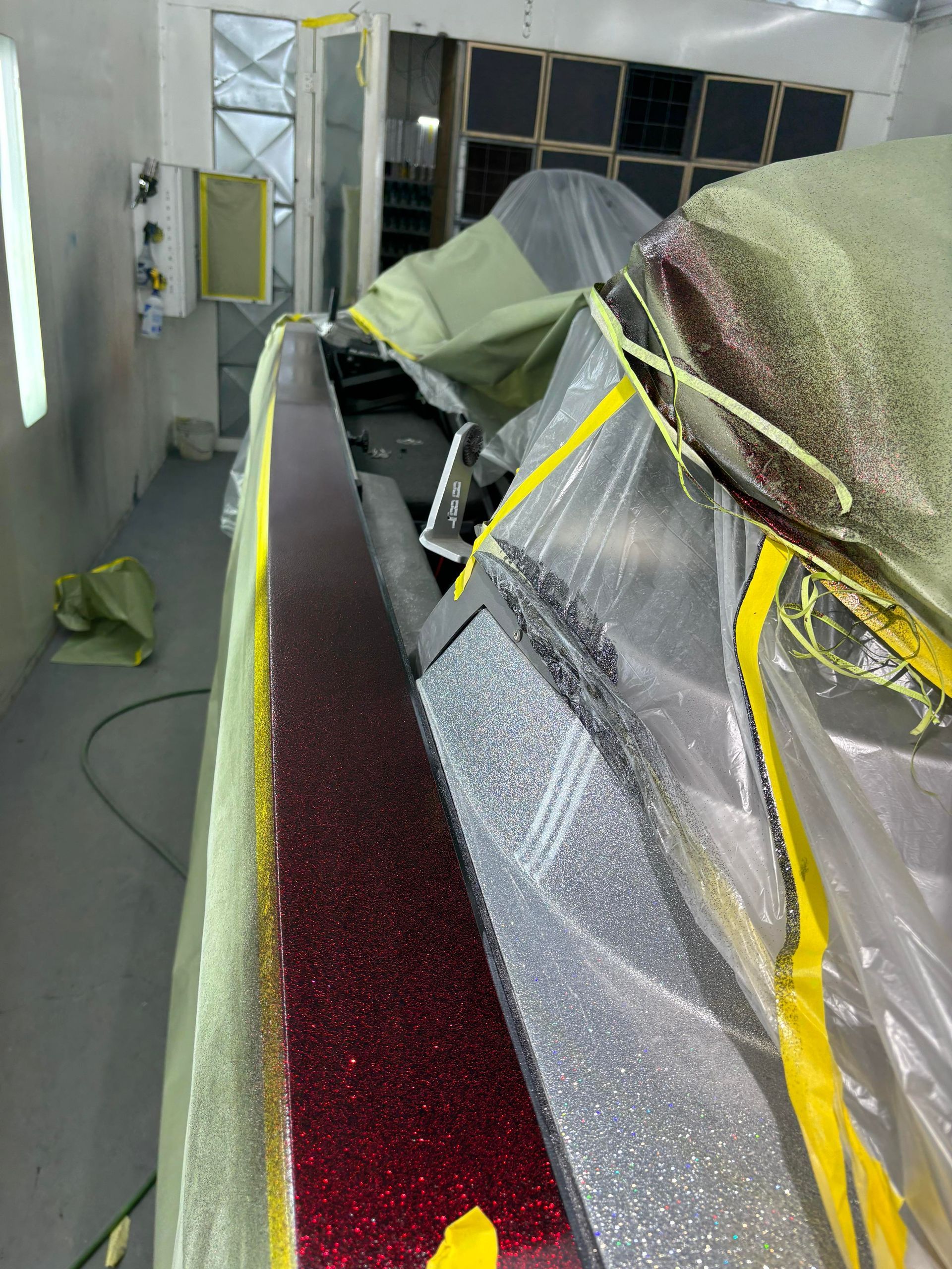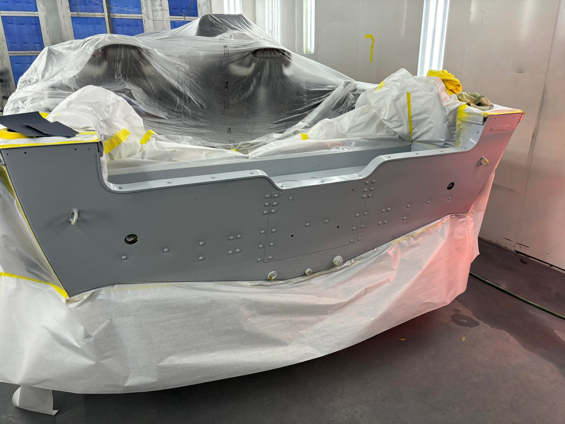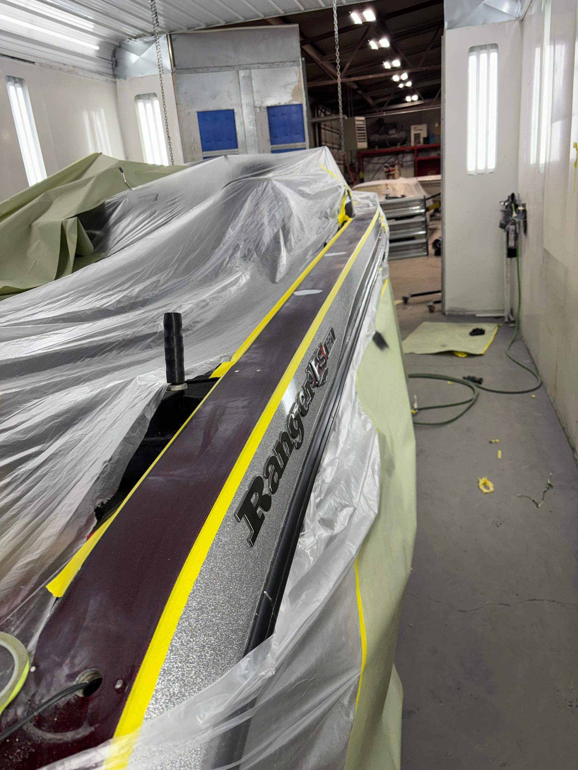 a boat is being painted in a paint booth