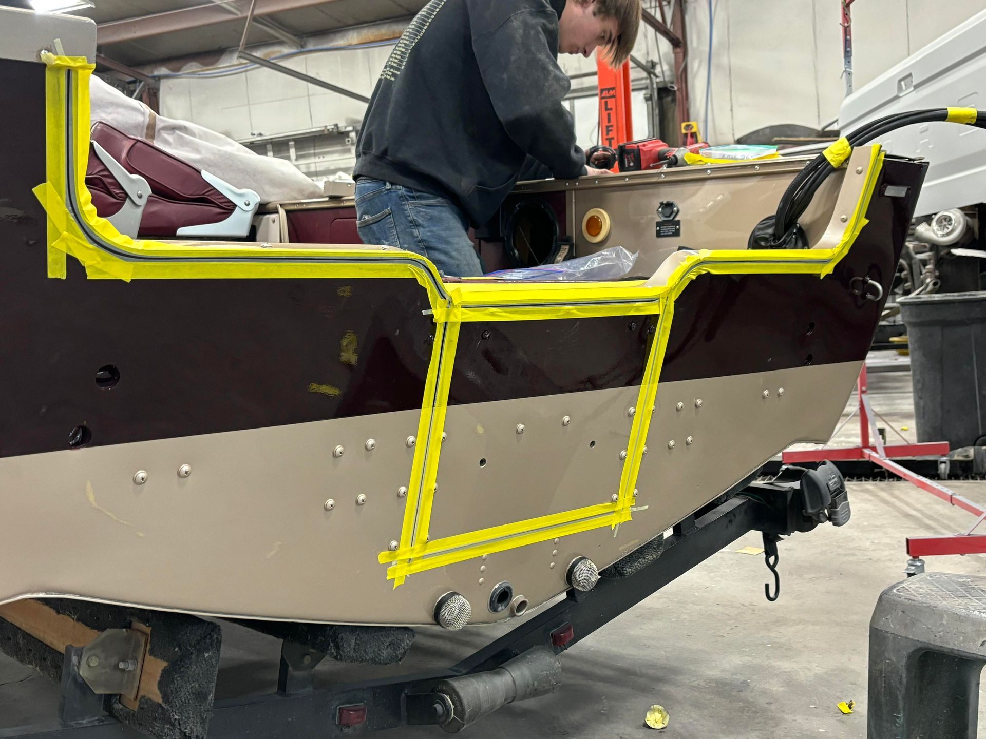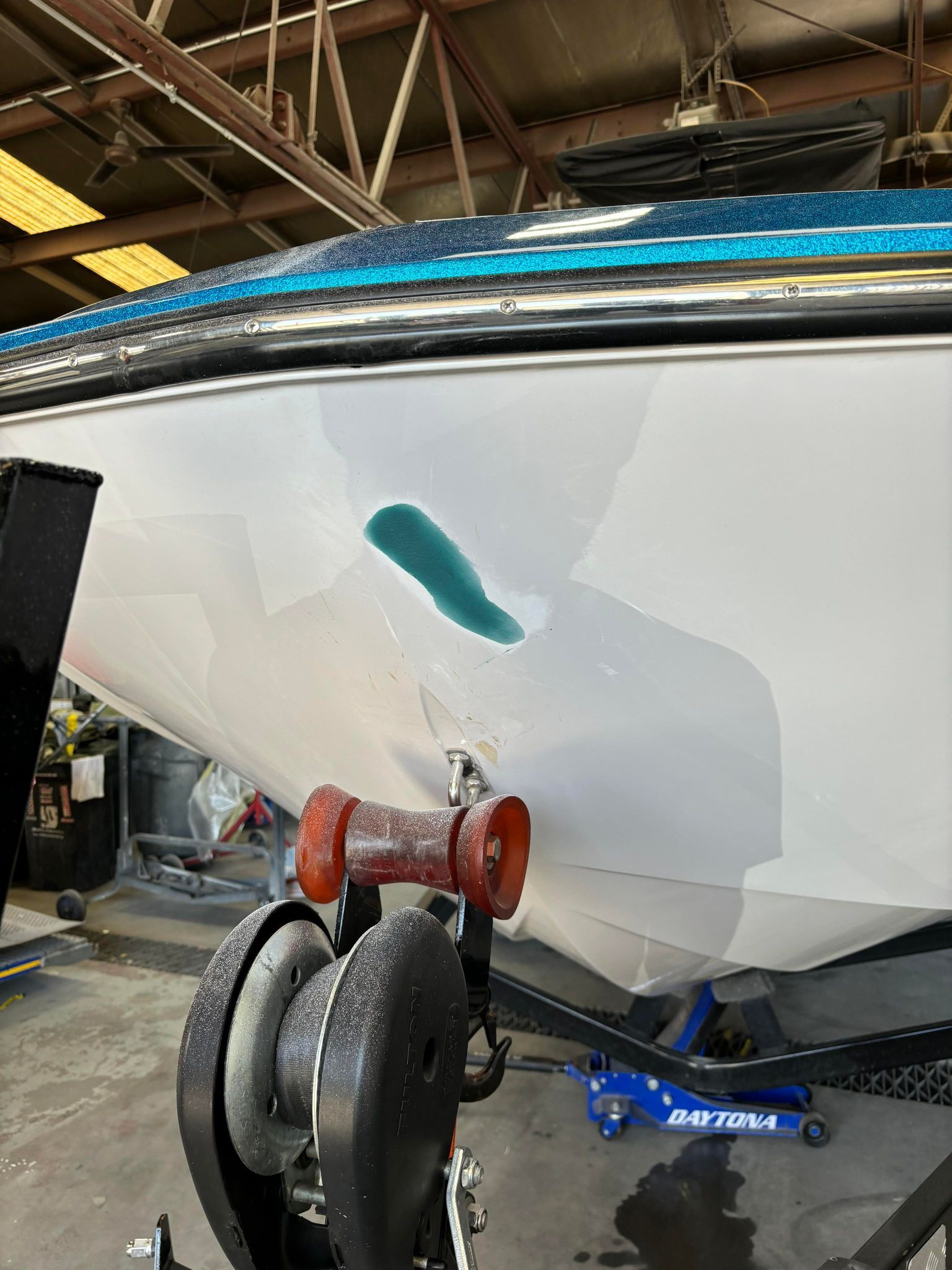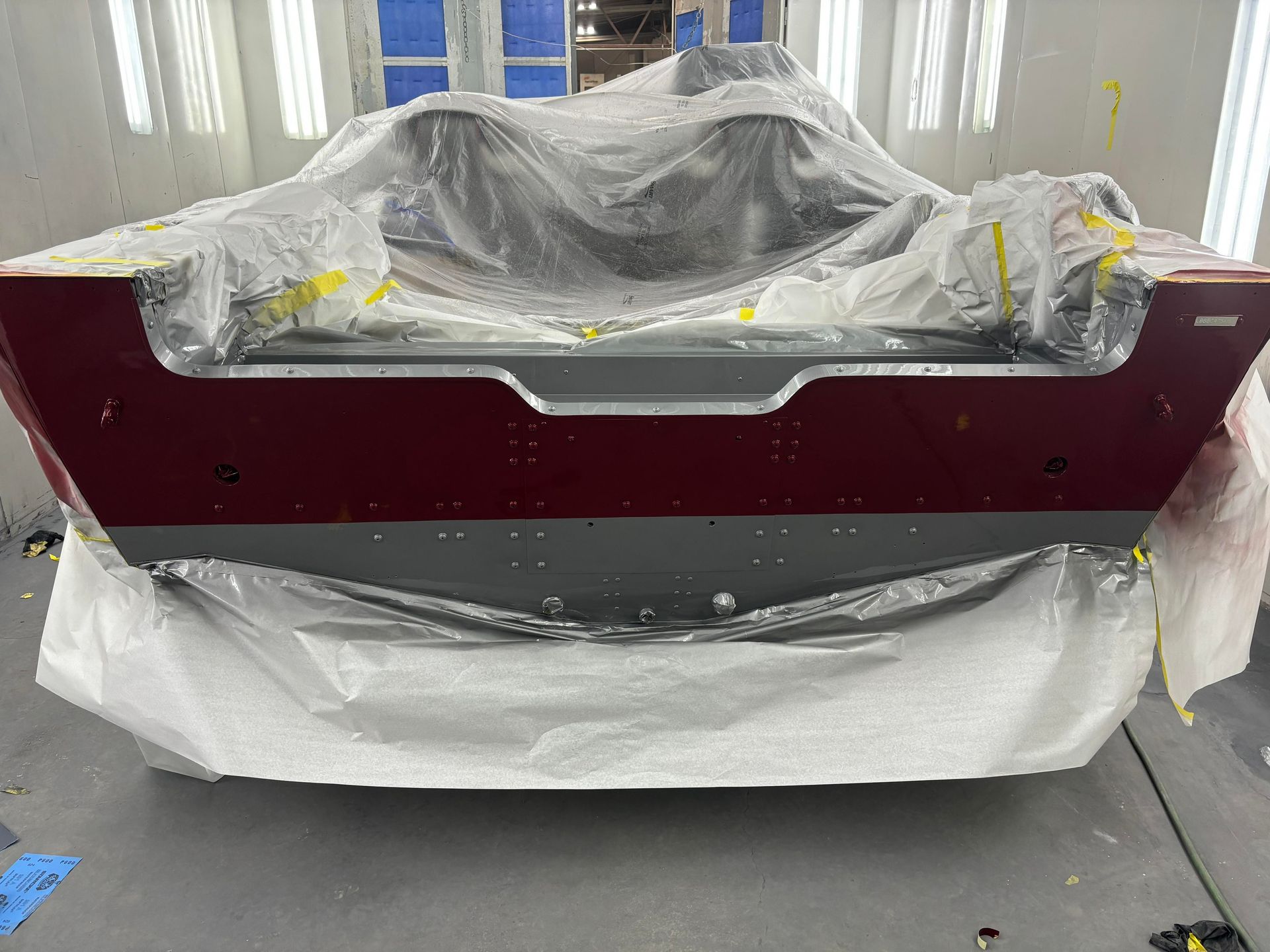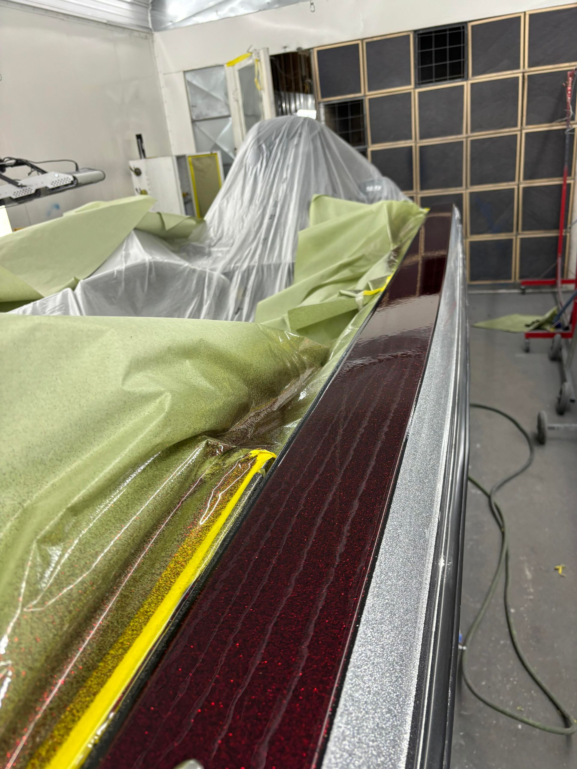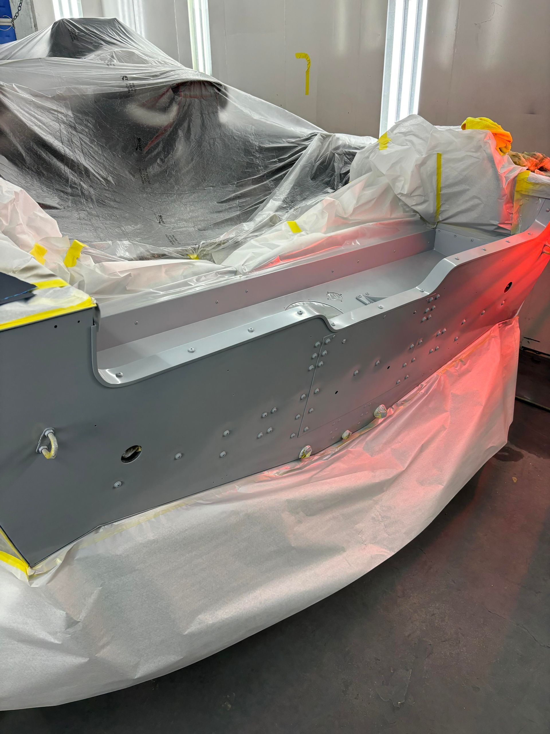 a boat is being painted in a paint booth