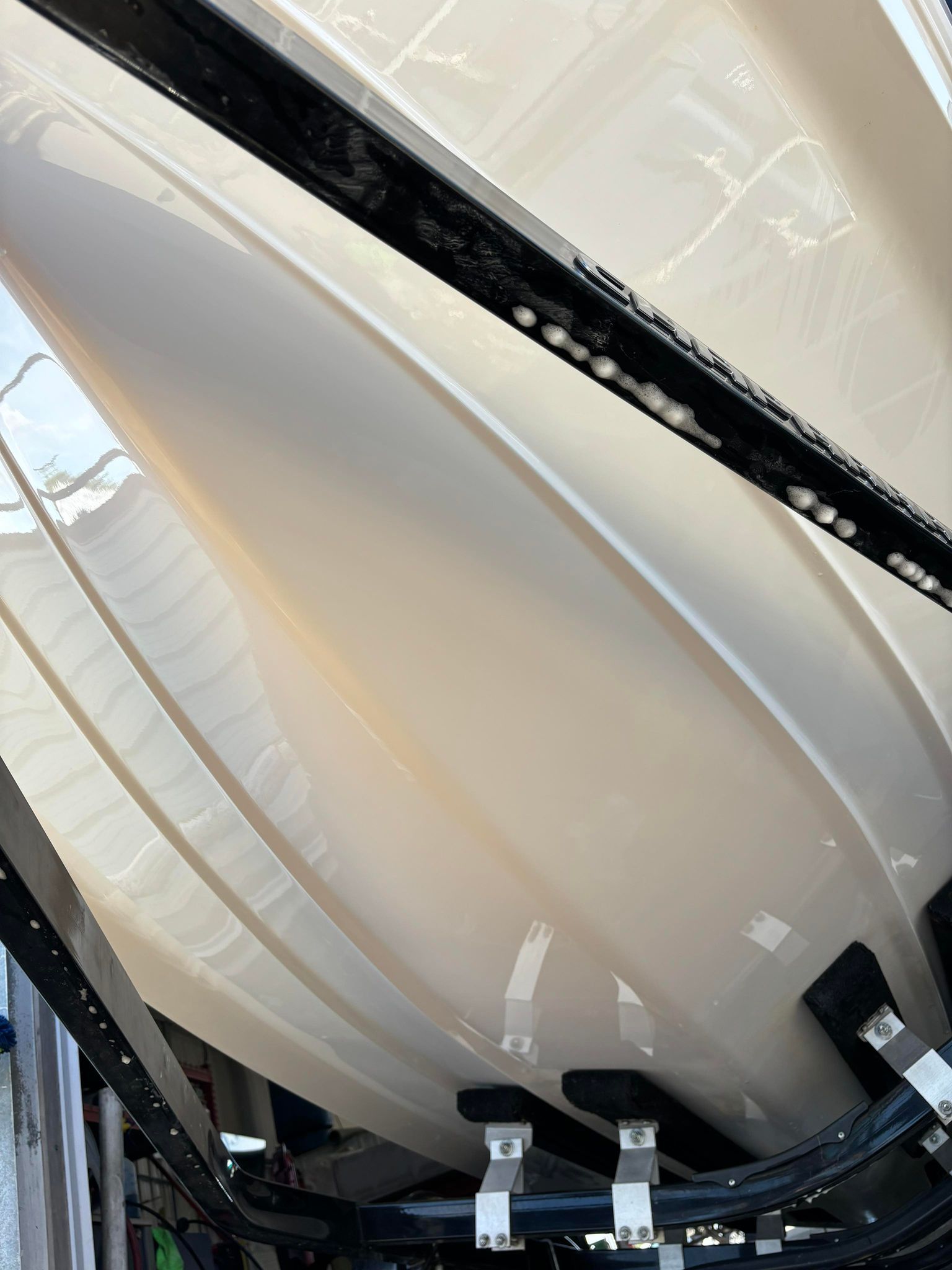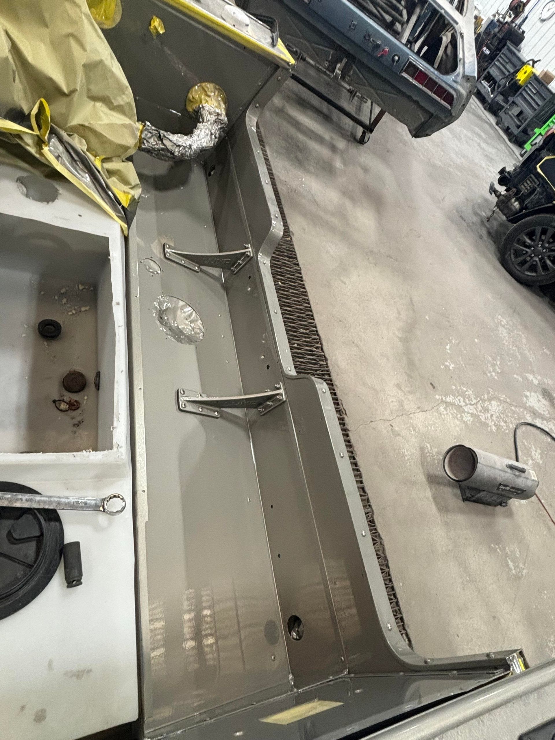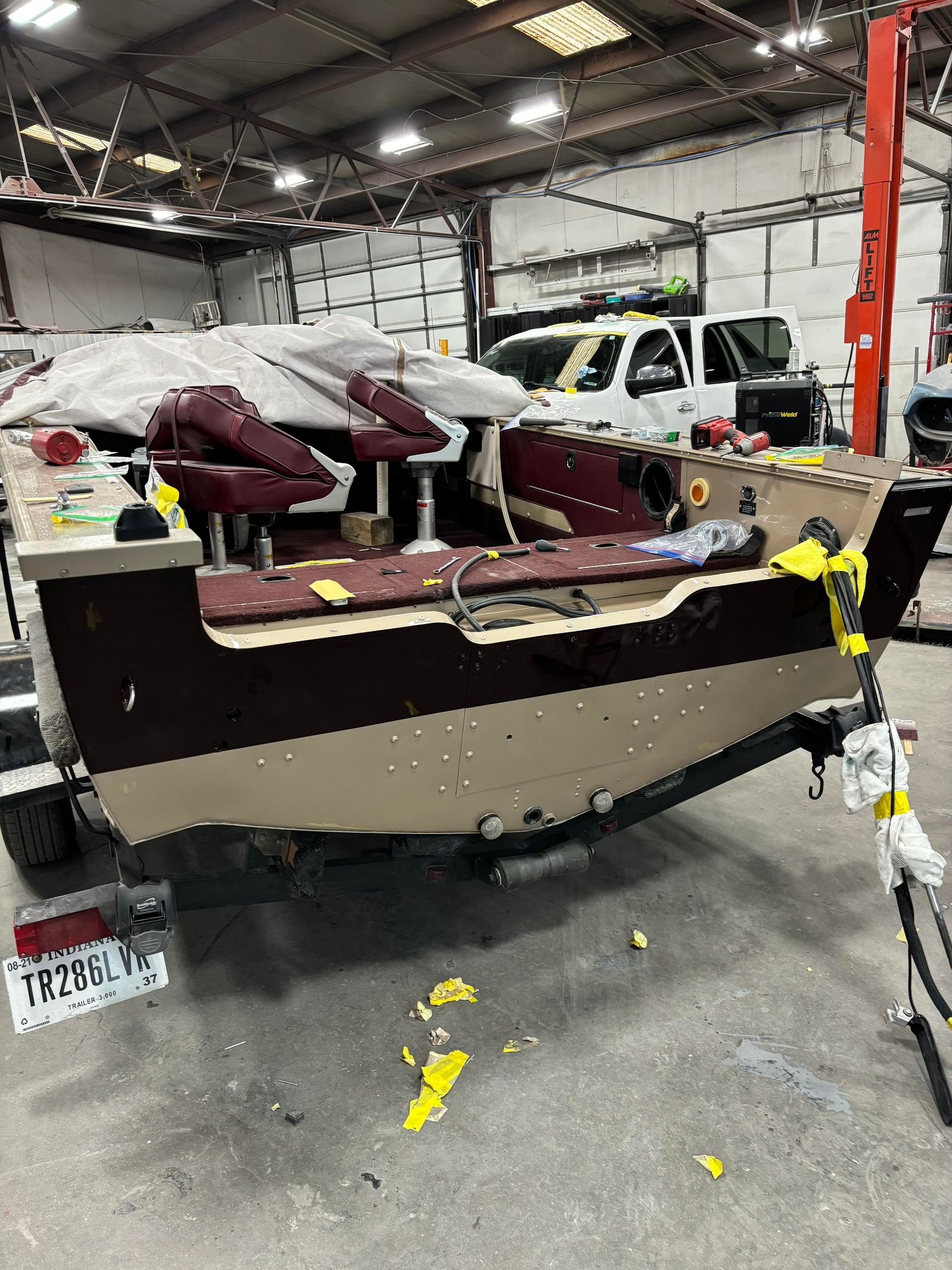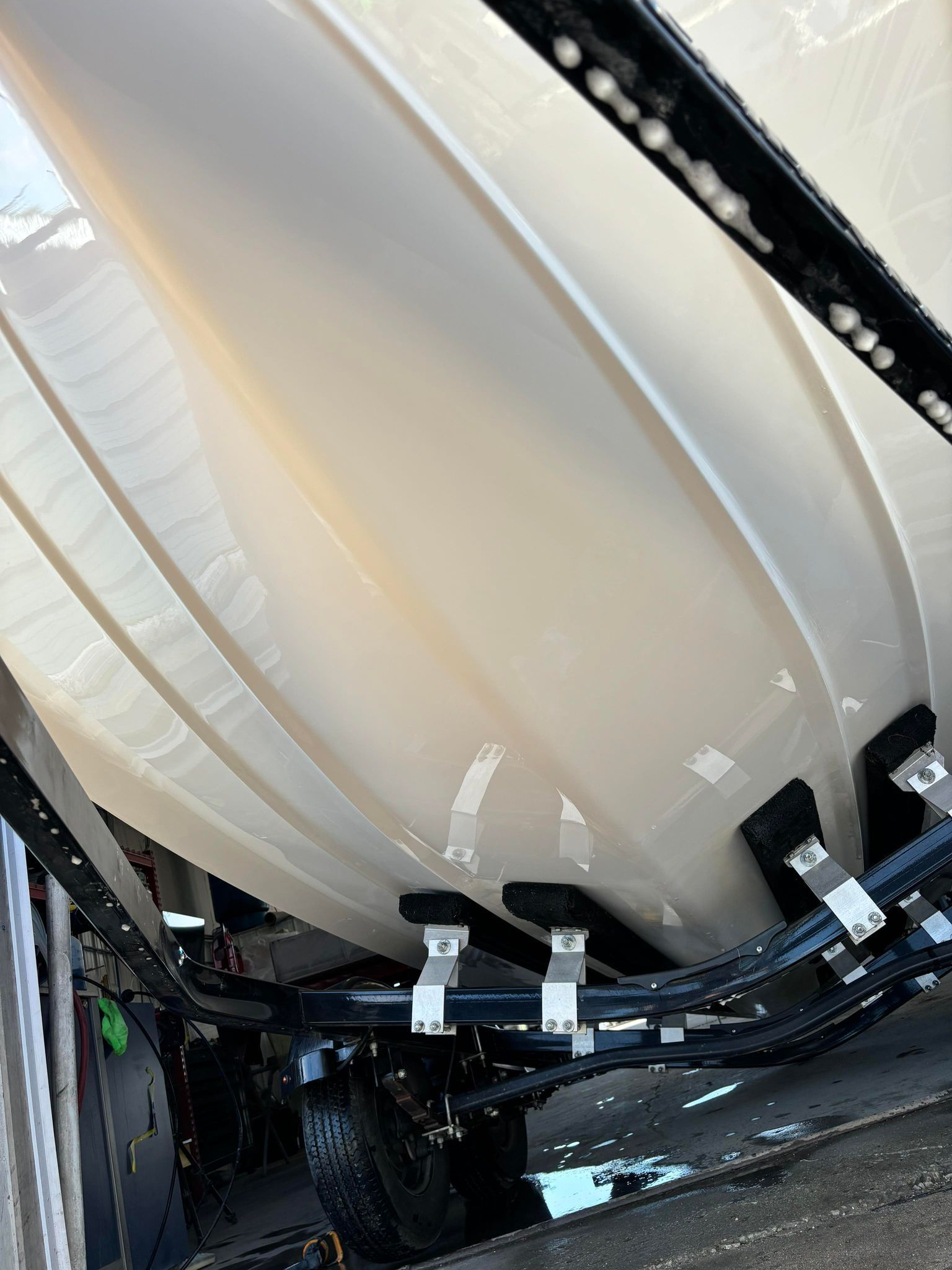 a boat is being painted in a paint booth