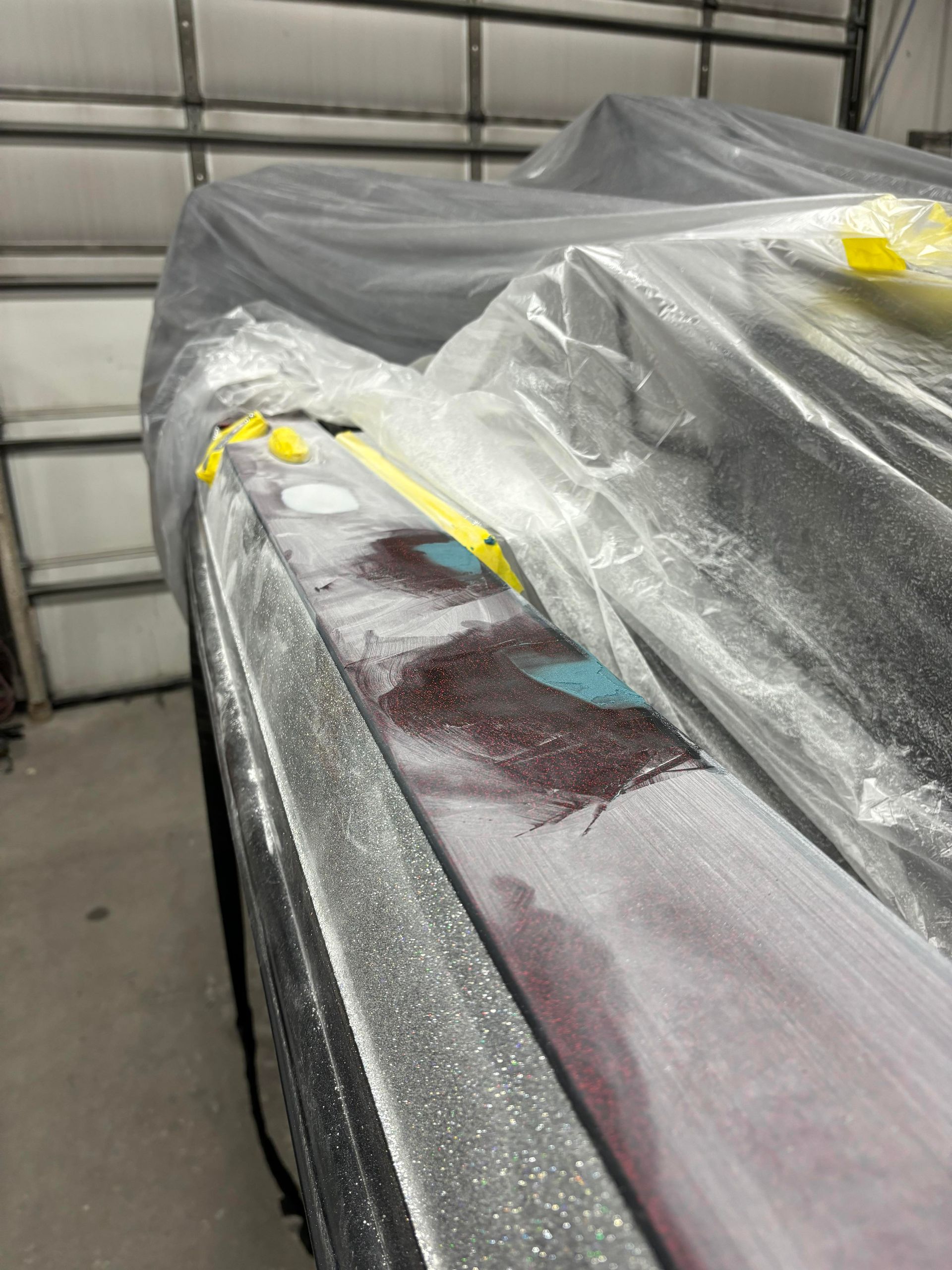 a car is being painted in a garage and is covered in plastic wrap