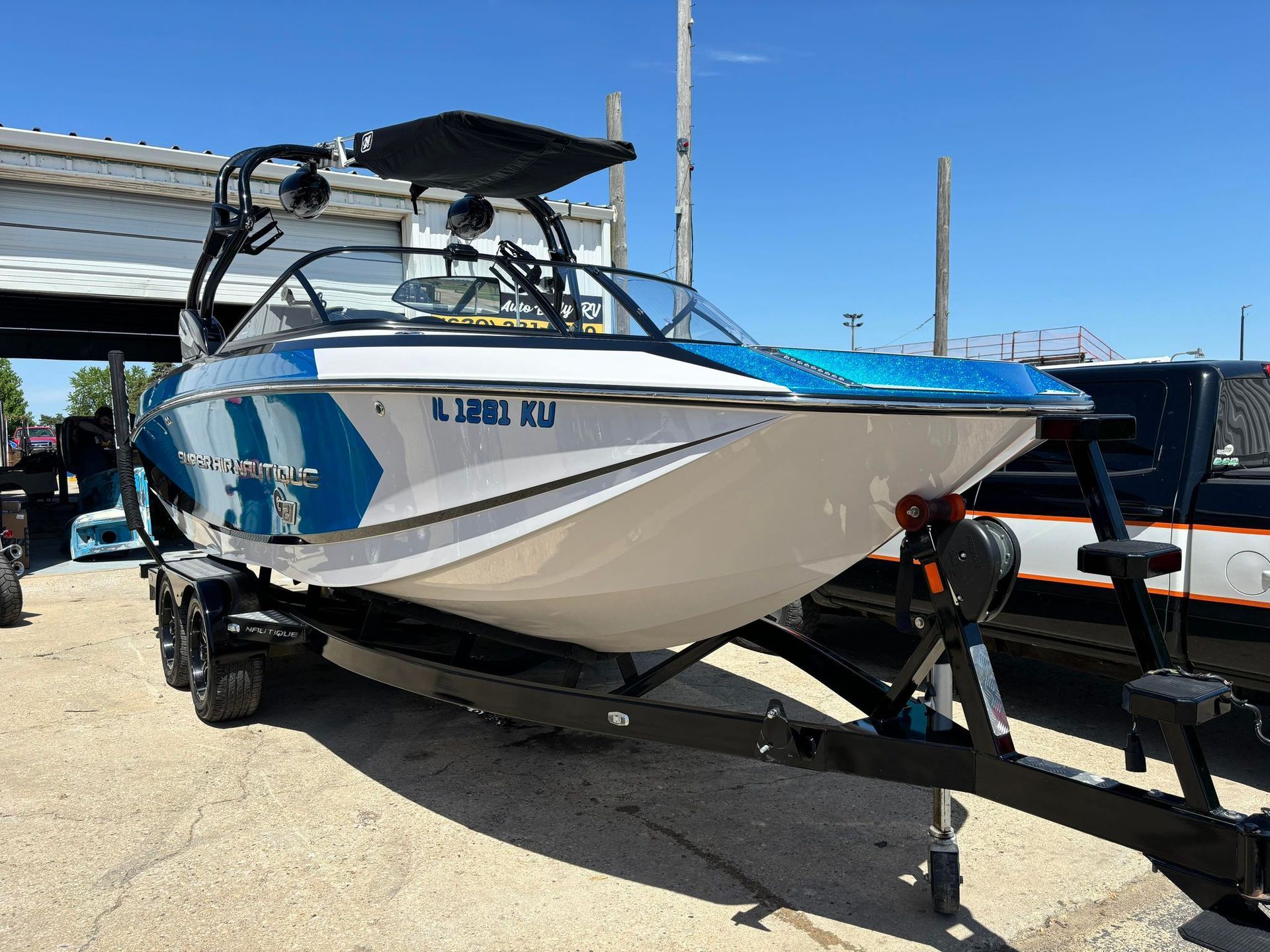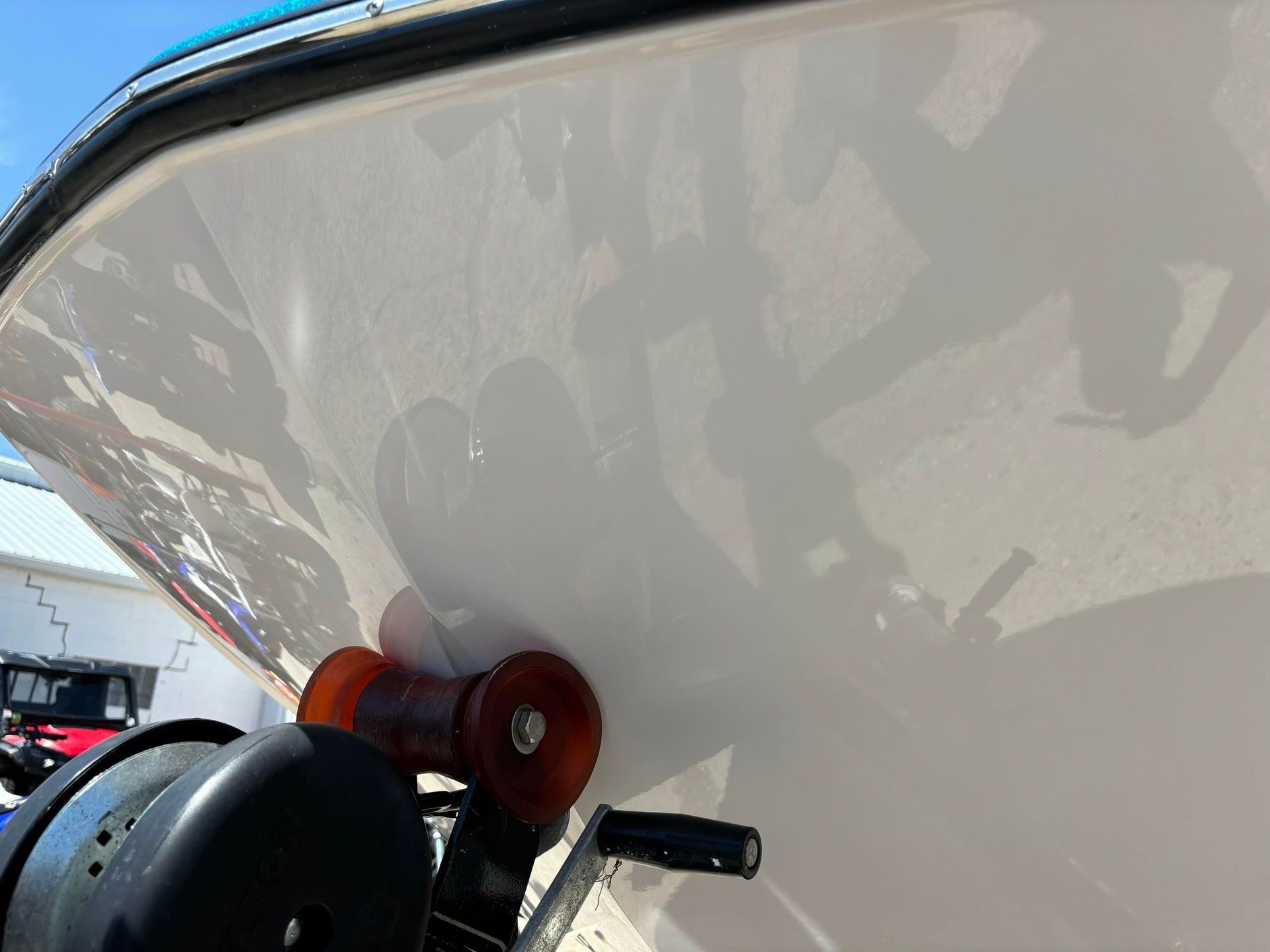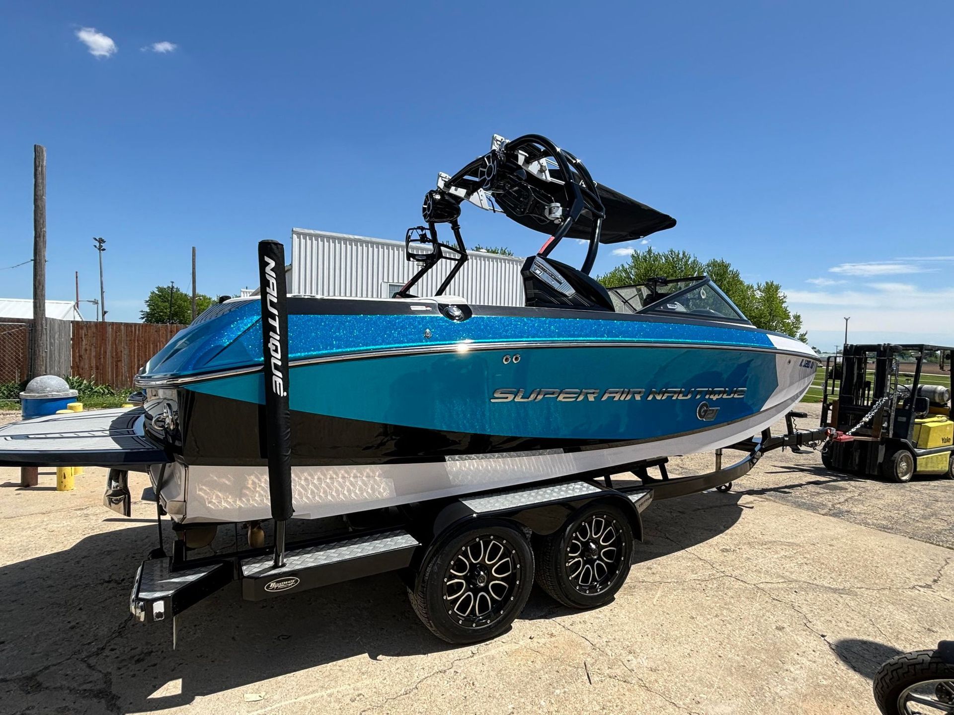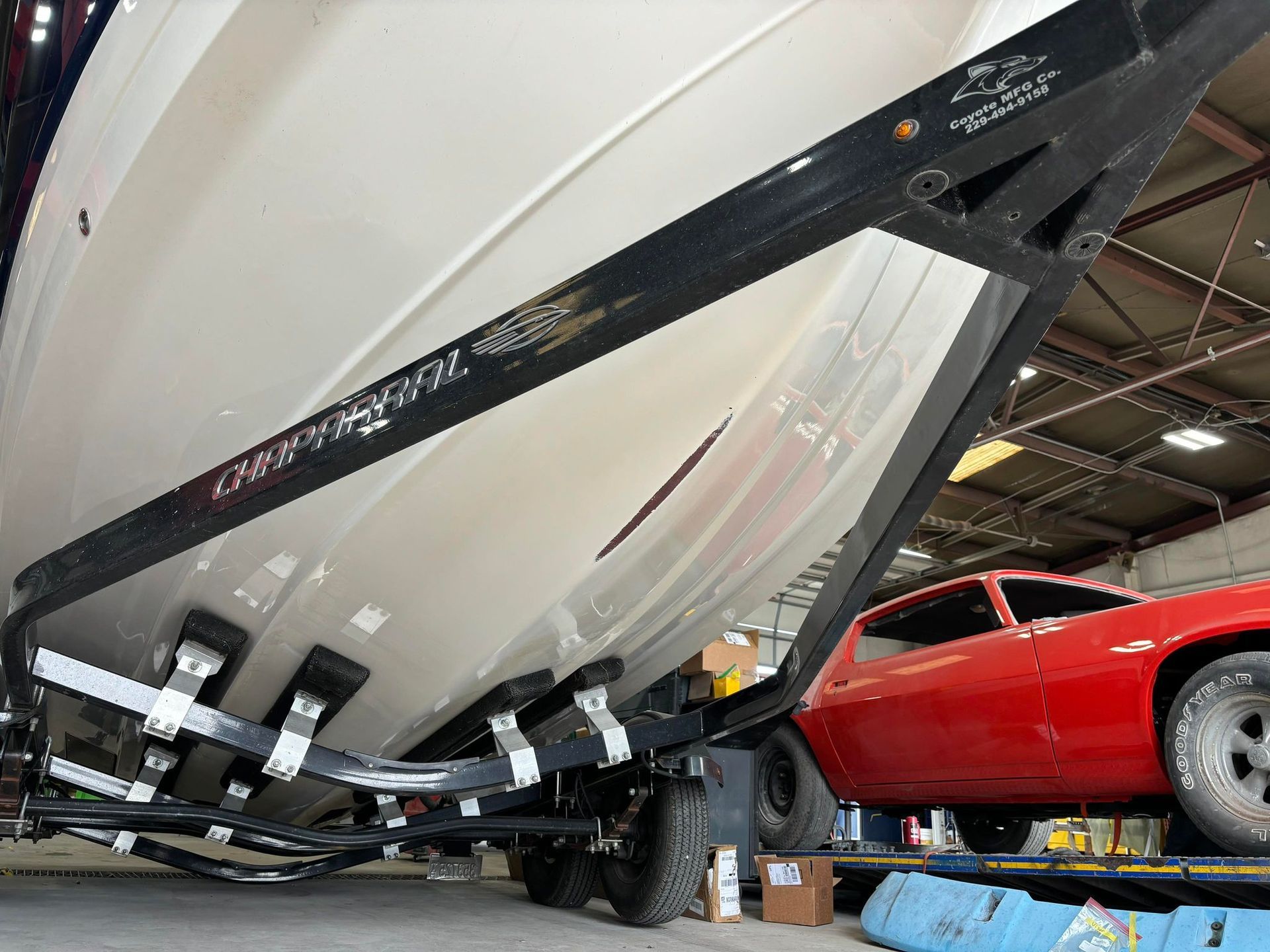 a boat is parked on a trailer in a parking lot