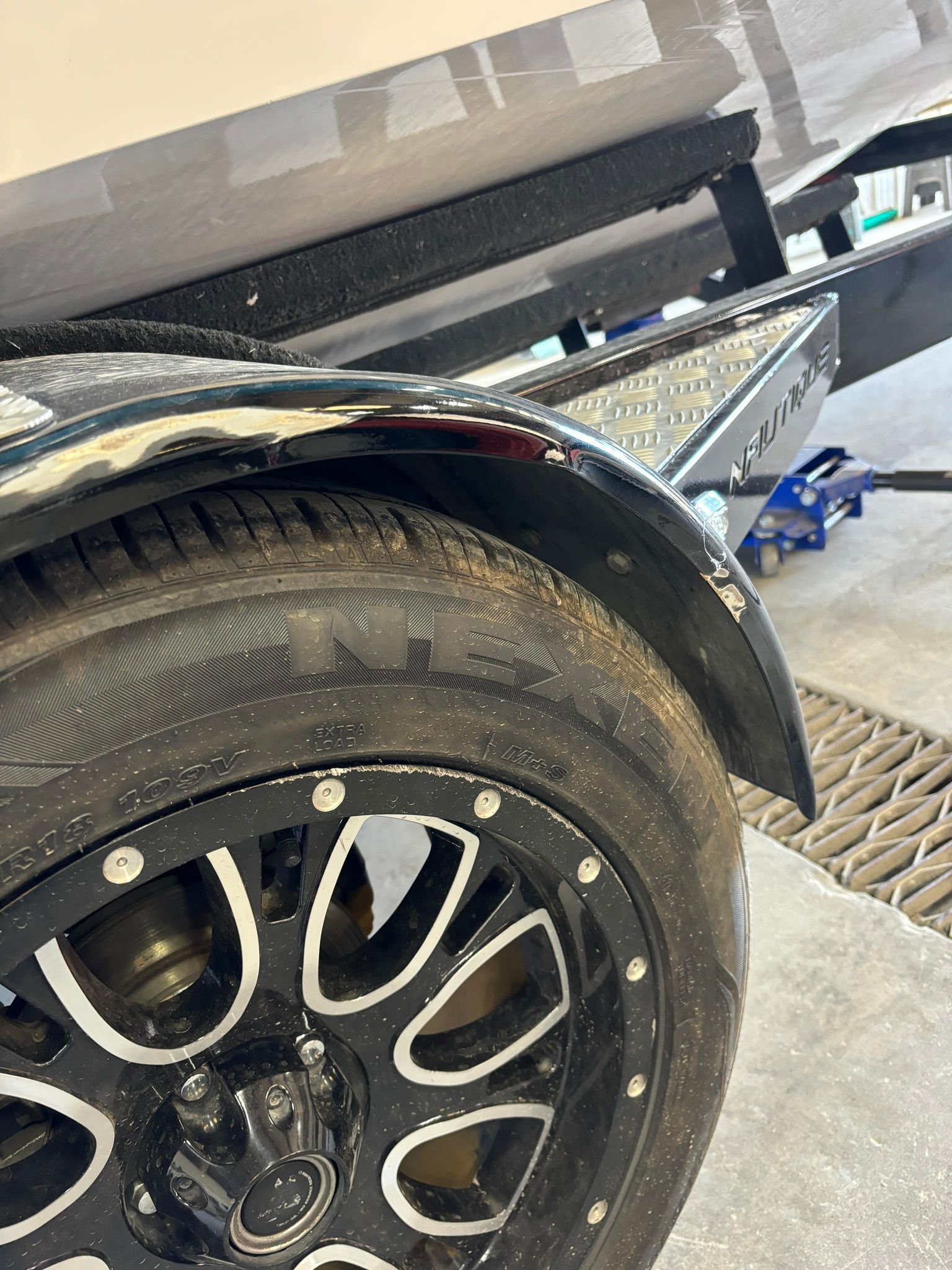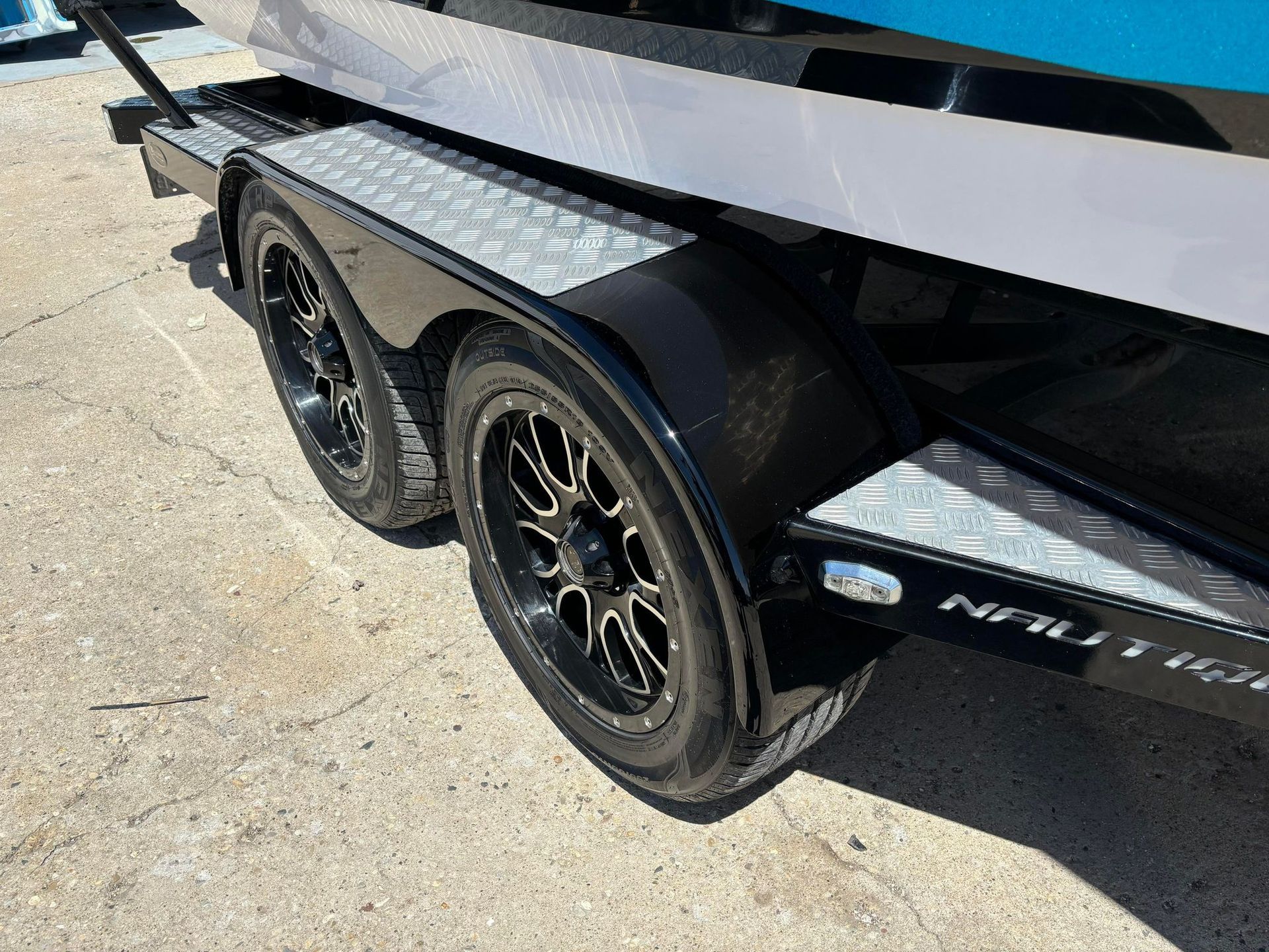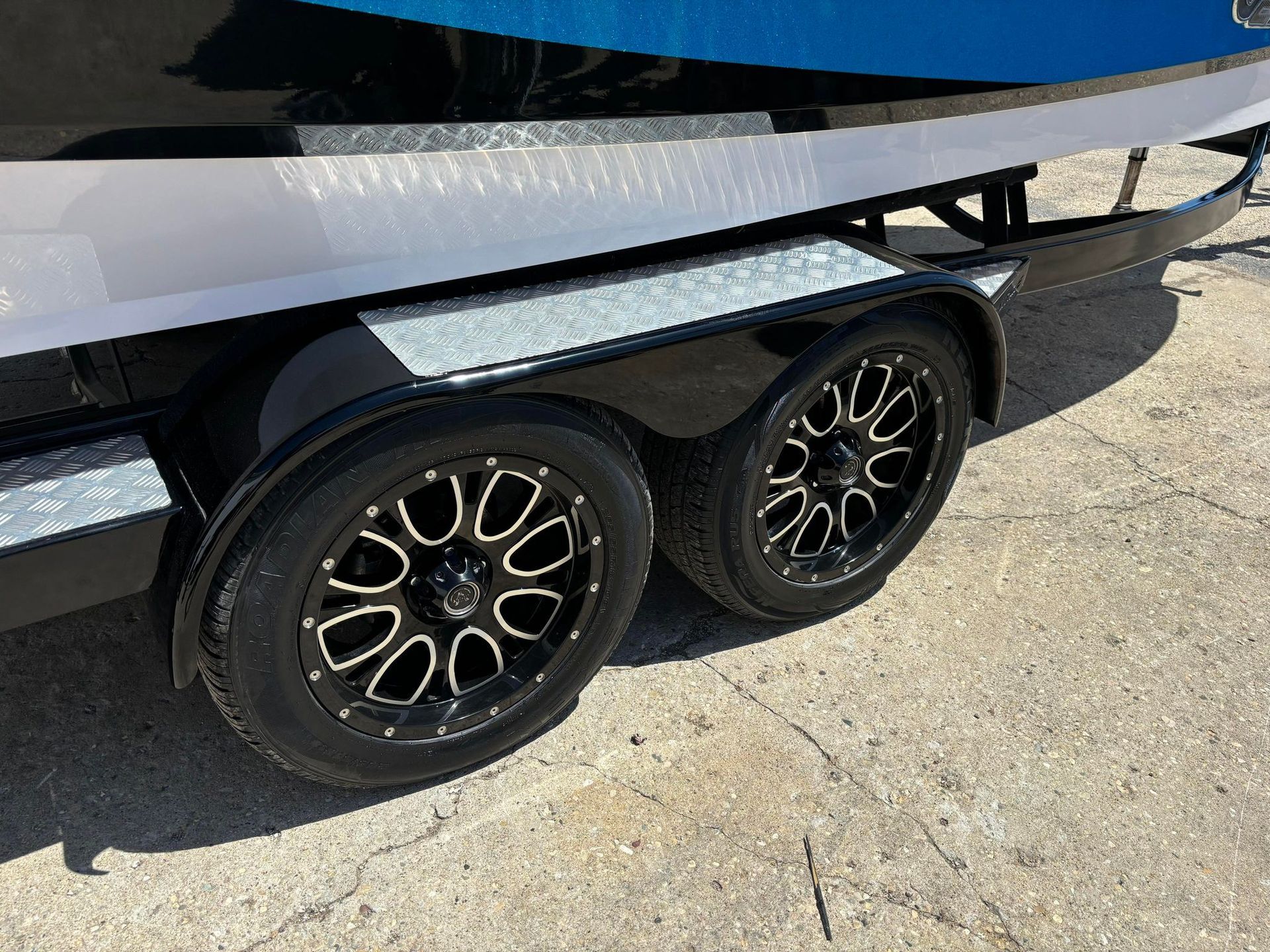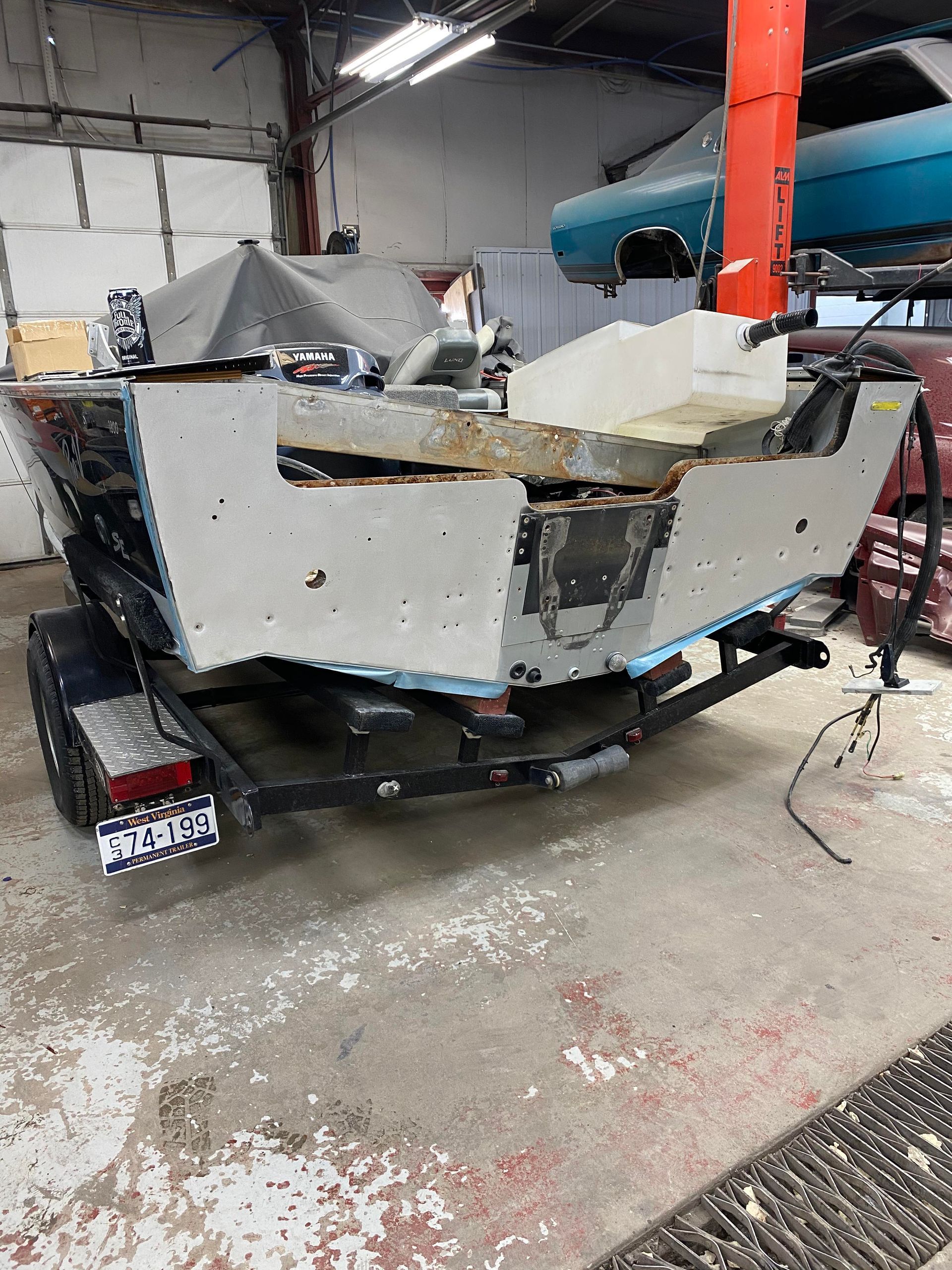 a boat is parked on a trailer in a parking lot